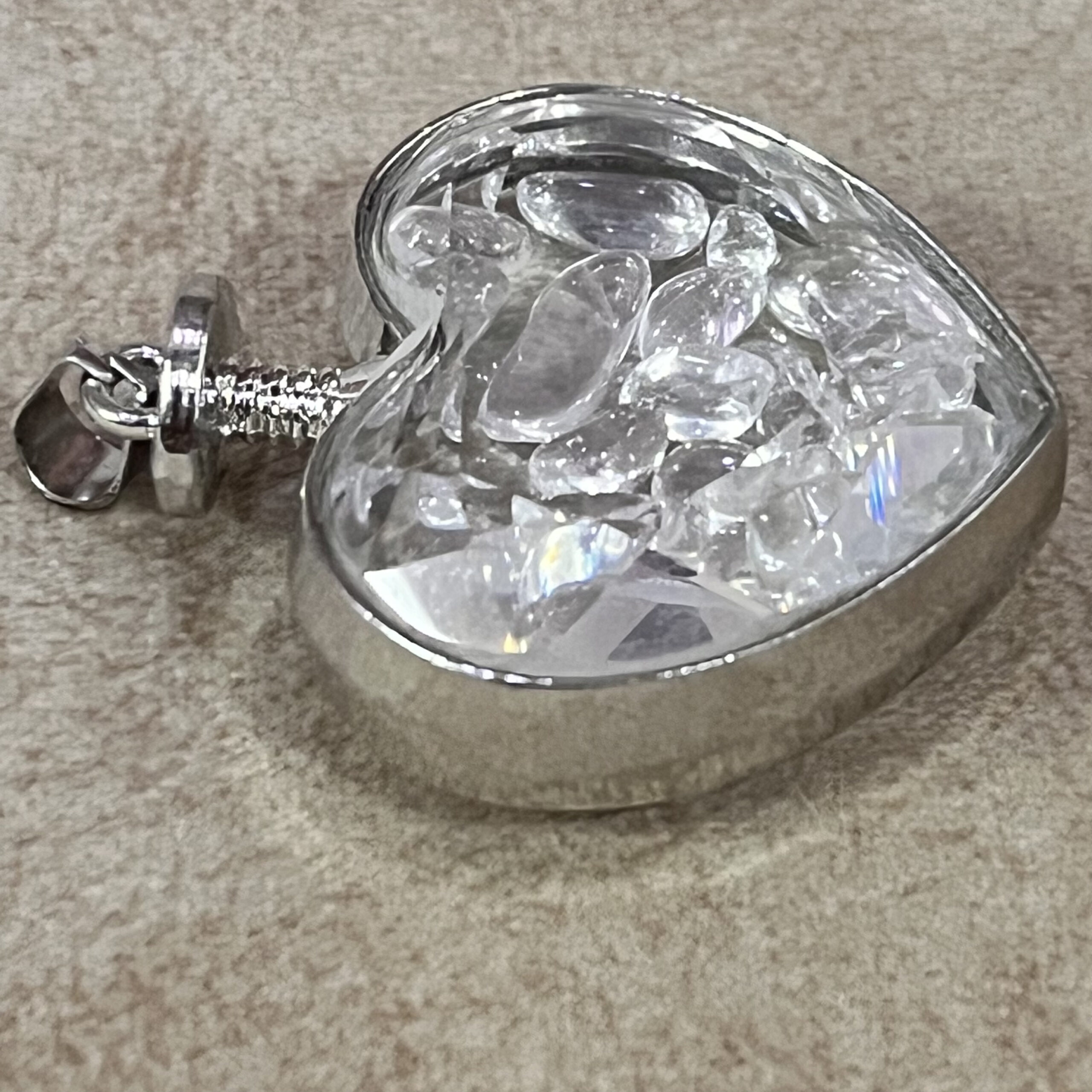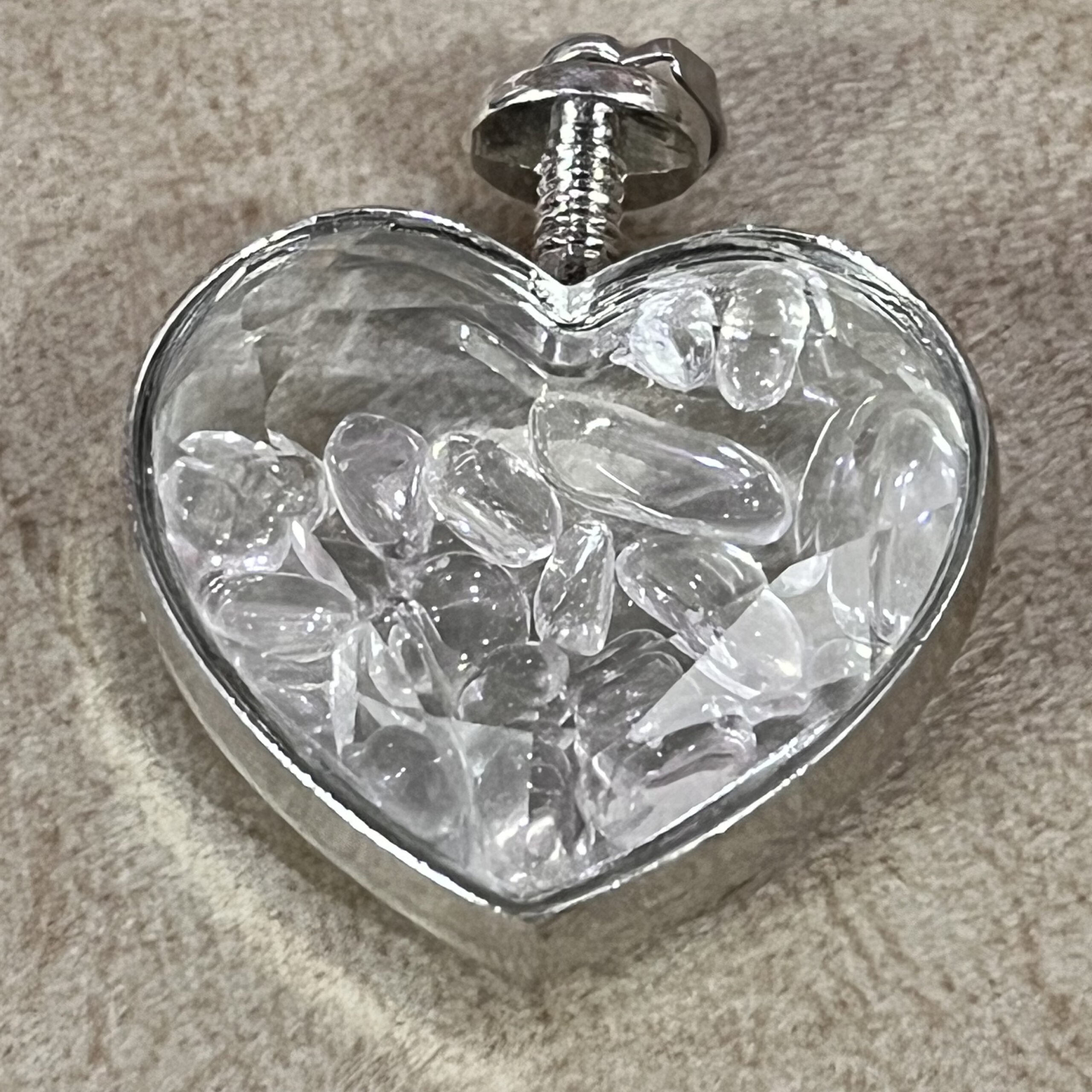 The pendant features a heart-shaped design filled with Clear Quartz chips, radiating purity and light. This elegant form symbolizes love, healing, and emotional clarity.